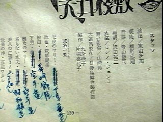 修司の扉 寺山さんとの思い出 その13 稽古で使用した右側のトップ・ペ−ジである。 毛皮マリ−・下馬二五七、欣也・萩原朔美はそのままになっているが、私の記憶ではヨ−ロッパ公演の本番は欣也役を彦凪ワタル氏がやったような気がする。 精吾の部屋index行き ■top page行き