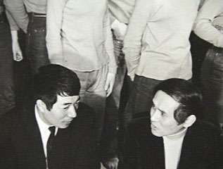修司の扉 寺山さんとの思い出 その7 若き黛敏郎氏と寺山さんである。場所は地下劇場。公演が始まって数ヵ月後に黛氏が司会をやっていた「題名のない音楽会」の収録時のワン・ショット。 番組のため観客なしで最後まで上演した。後ろは我々、皆、お揃いの真っ赤な長袖シャツにGパンスタイルであった。残念ながらこの放映は見ていない。 ←全体はこんな感じでした。 精吾の部屋index行き ■top page行き