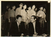 若き黛敏郎氏と寺山さんである。場所は地下劇場。公演が始まって数ヵ月後に黛氏が司会をやっていた「題名のない音楽会」の収録時のワン・ショット。 番組のため観客なしで最後まで上演した。後ろは我々、皆、お揃いの真っ赤な長袖シャツにGパンスタイルであった。残念ながらこの放映は見ていない。