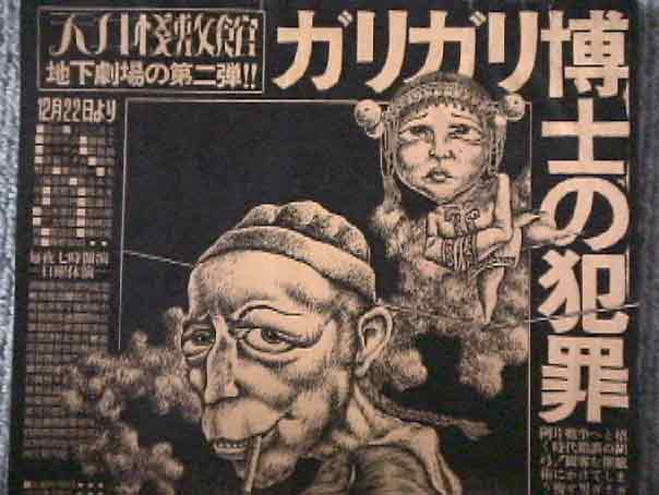 さて、関西公演から帰った劇団は天井桟敷館第2弾公演「ガリガリ博士の犯罪」の稽古に入っていった。 僕は「四十一番目の男」という役であった。 ころころ変貌してゆく役に四苦八苦し、なんども寺山さんに怒鳴られた。 絵は手持ちのチラシから撮ったがポスタ−は確かきれいなカラ−だったような気がする。