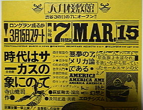 桟敷の扉 劇団の思い出 その5 No.1 下の画像はポスターの一部です。クリックすれば画像全体とコメントが見られます。 No.1 No.2 No.3 天井桟敷館こけら落しのポスタ−である。縦約40cm×横19cm、細長くチラシも兼ねていた。 今の私(昭和)の撮影技術では1枚に撮れず上中下の3段階のアップになってしまった。 初演時のポスターは全て黄色だったが、再演、再々演の時は青が加わり寺山さんが 〜萩原朔美に捧ぐ〜 と題した「ス−パ−マンの詩」が裏面 に載せられていた。 35年が過ぎさり今、ヤオ・タテキとイッキが語りを得意とする詩になってしまった。 精吾の部屋index行き ■top page行き