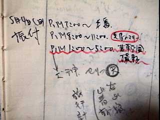 pm8:00〜11:00毛皮のマリ−の稽古、ノ−ト右側にはam9:00〜10:00斎藤〜しみず〜(当時、新宿東口にあった喫茶店である)