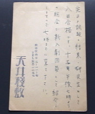 「先日の試験の結果・研究生として入団合格です。十五日午後七時よりの総会で新入劇団員として紹介しますので七時までに来て下さい。 渋谷区渋谷三ノ十一ノ七 TEL四〇九)一一五七 天井桟敷」