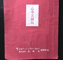 1月24日顔合わせ、27日クランク・イン2月9日まで(多分、これは拘束期間であろう)台本のうしろにはそう書かれてある。入団して間もない時だった。目黒のスタジオは寒かったが待ちの間スト−ブを囲み、吉右衛門氏のゲテモノ食いの話や外国から帰って来たばかりの小松方正氏の「言葉?ああ、いらん、いらん、身振り手振りでみんな通 じる!」それなりに楽しい仕事だった。この時も黒子・鎌田賢になっている。名付け親は萩原朔美氏、最初は昭和賢、字体が冴えないのでクレ−ムをつけ精吾してもらった。これには訳があるが今度にする。しかし、いつから昭和精吾になったか全く本人自身も判っていない。この台本もオ−クションにかけようと思ったが中を見て愕然。チョイ役と言うよりは仕出し同然なのに台本に向かってウンチクいっぱい喋りまくっていることが、そのまま書かれているためやめることにした。